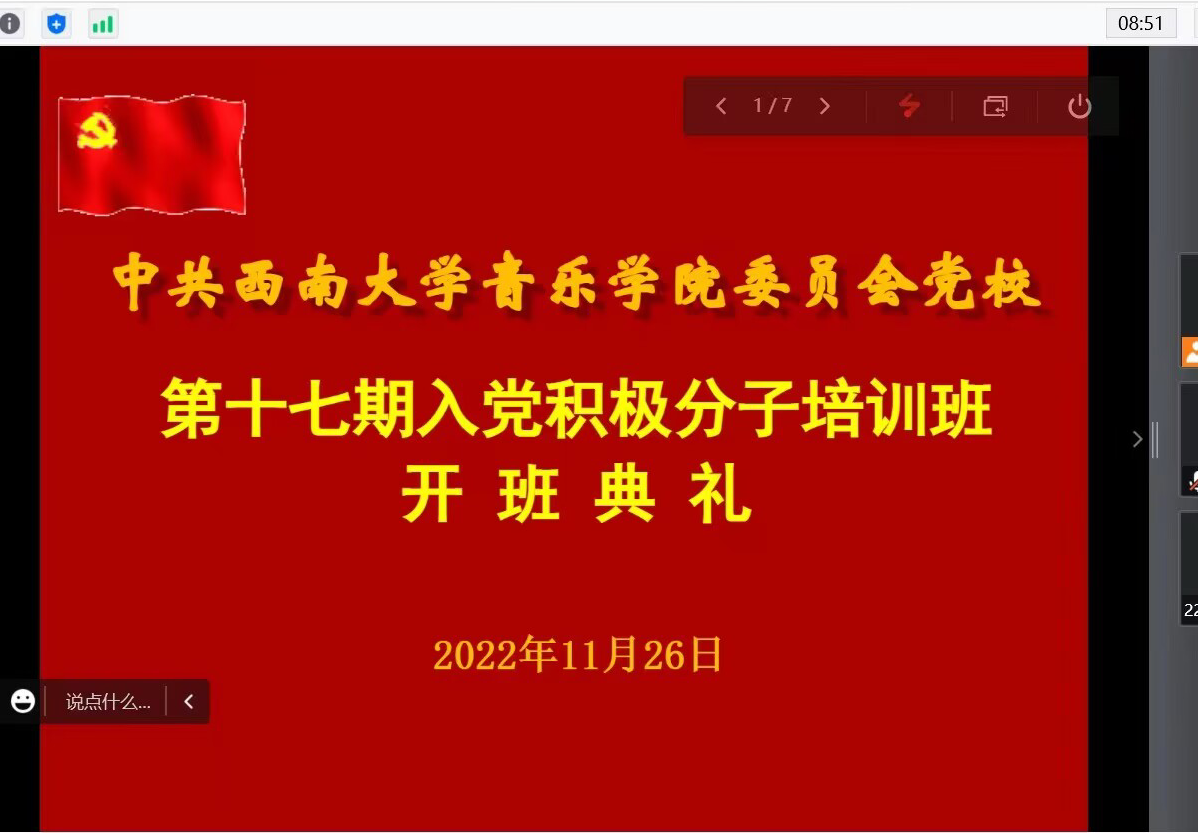11月26日上午,中共西南大学必赢3003no1线路检测中心委员会分党校第十七期入党积极分子培训班开班典礼通过线上形式庄严拉开帷幕。学院党委书记魏培修、组织员胡菡子、本科生2022级辅导员龚雪及全体党校学员参加,典礼由学院党委副书...