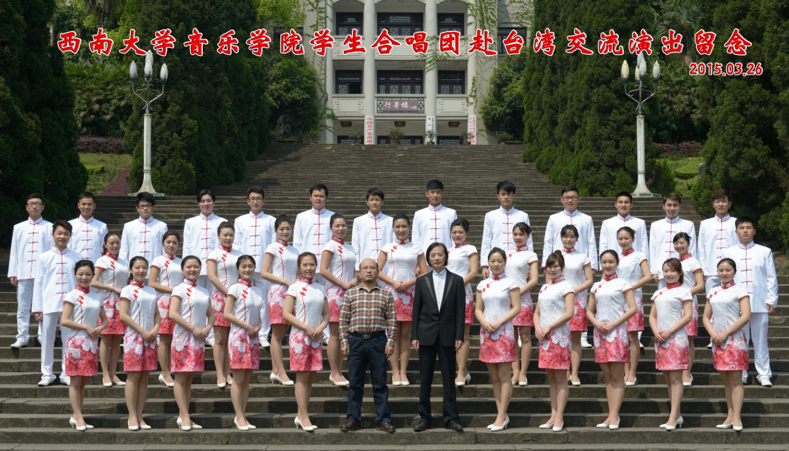 指挥:左倩 西南大学必赢3003no1线路检测中心民族合唱团指挥,交响乐团指挥,圣彼得堡国立文化艺术大学音乐博士,中国音乐家协会会员,重庆市音乐家协会会员,重庆市合唱协会会员,重庆北碚区音乐家协会理事,俄罗斯《彼得巴沃斯科国际大赛》银奖获得者,在俄罗斯求学阶段,曾执棒圣彼得堡国立文化艺术大学交响乐团进行多次大型演出。执棒重庆市青年交响乐团进行多次《高雅艺术进校园》演出活动及各类受邀的社会活动。多次受重庆市教委邀请,进行指挥专题讲座及培训,多次指挥合唱团及交响乐团参加重庆市委,重庆市宣传部组织的演出活动以及国内各类艺术交流活动。