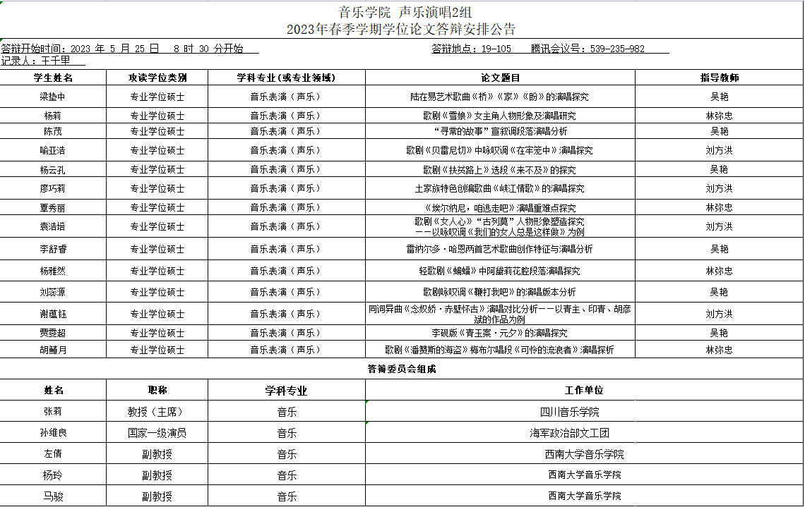 2023年西南大必赢3003no1线路检测中心春季硕士研究生答辩安排——声乐演唱2组