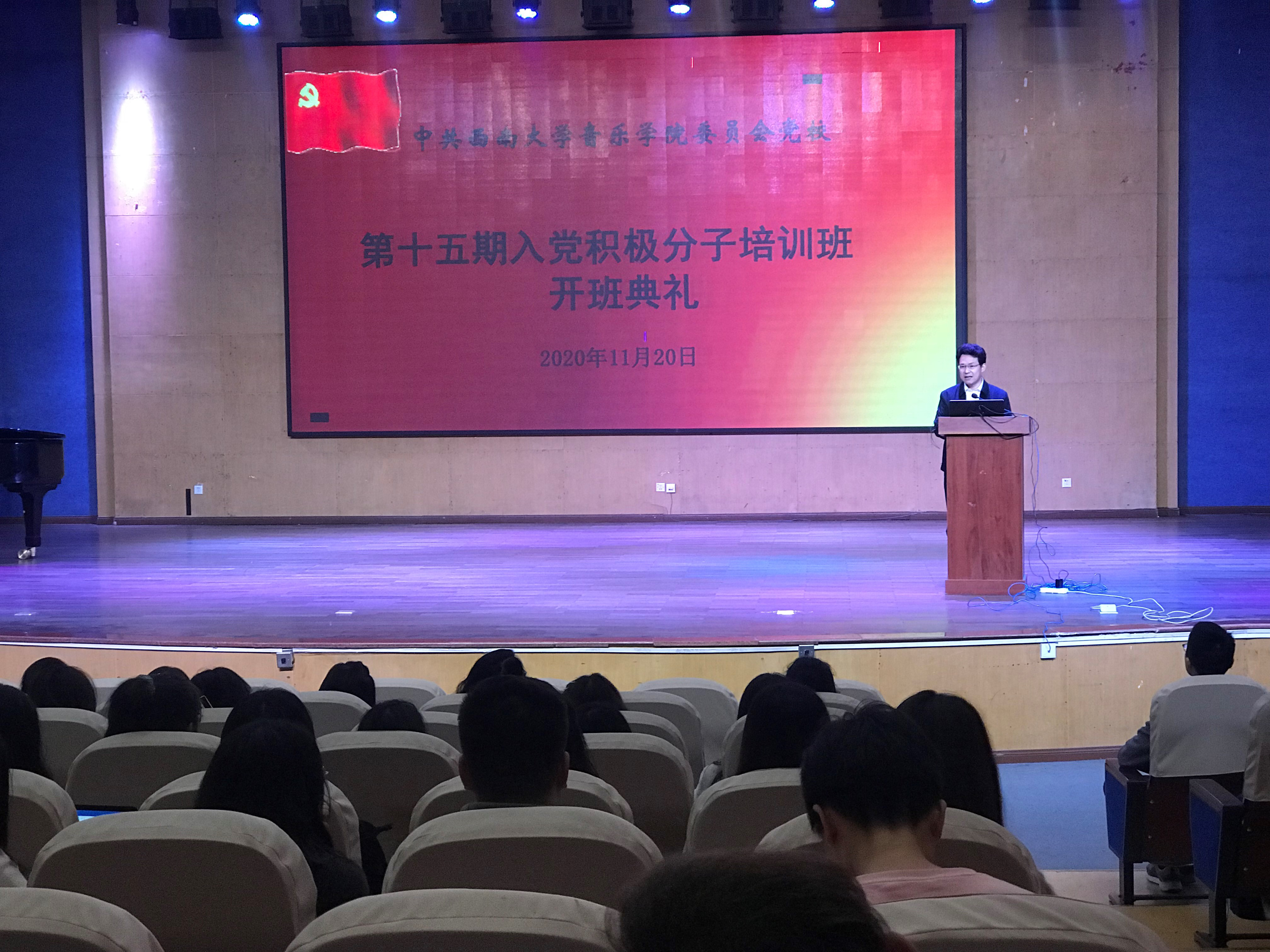11月20日下午2:30, 中共西南大学必赢3003no1线路检测中心委员会第十五期党校入党积极分子培训班开班典礼在必赢3003no1线路检测中心小演奏厅举行。必赢3003no1线路检测中心党委书记罗义文、副书记陈铮、组织员胡菡子、团委书记杜和军及全体学员参加,典礼由陈铮副书记主持。