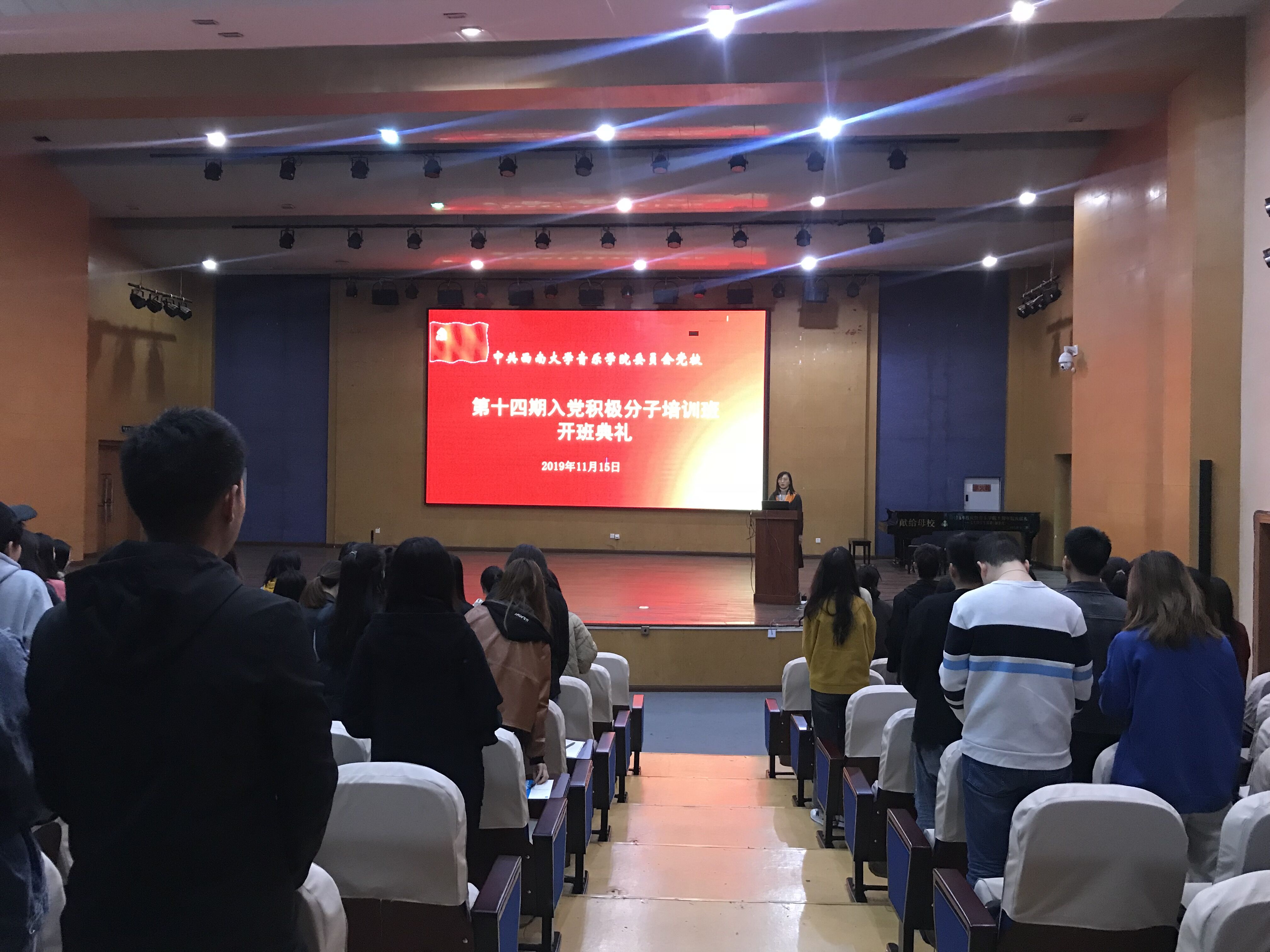 11月15日下午4点, 中共西南大学必赢3003no1线路检测中心委员会党校第十四期入党积极分子培训班开学典礼在必赢3003no1线路检测中心小演奏厅举行。必赢3003no1线路检测中心党委书记罗义文、副书记陈铮、组织员胡菡子、本科生2019级党支部书记张磊及全体学员参加,典礼由陈铮副书记主持。