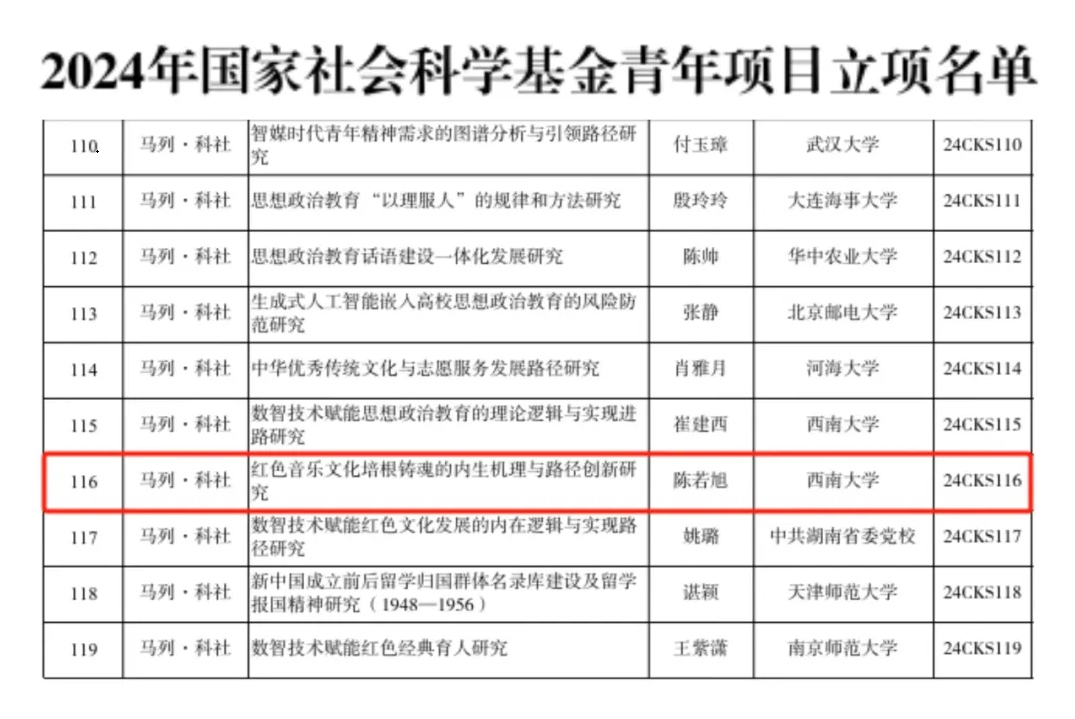 近日,全国哲学社会科学办公室公布了2024年国家社会科学基金年度项目的立项结果,必赢3003no1线路检测中心陈若旭教授申报的《红色音乐文化培根铸魂的内生机理与路径创新研究》获批青年基金(24CKS116)立项。