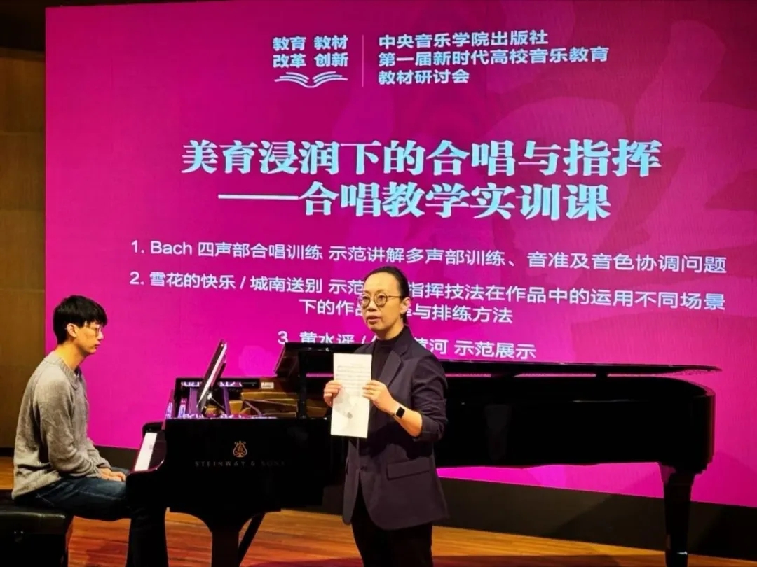 其他专家的报告同样精彩纷呈:陈冰教授探讨了美育视野下的合唱与指挥;林晔与孙晓丹教授深入探索新时代高校钢琴教育的发展路径;赵聆教授分享了钢琴教学法的创新探索;徐之彤教授阐述了即兴伴奏与作曲在音乐教育中的融合;张征教授聚焦素质型学校音乐教育实践;裴聿茹教授则探讨了乐理与试唱练耳在音乐技能训练中的实践。会议期间,中央必赢3003no1线路检测中心合唱团与音乐教育学院合唱团的精彩演出,为学术研讨增添了艺术的光彩。教材座谈环节更是激发了与会专家的深入交流,不同观点的碰撞迸发出智慧的火花。