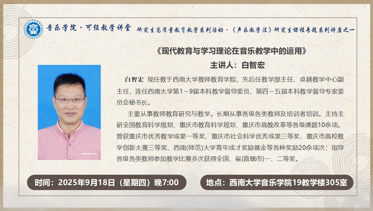 预告|9月18日19:00白智宏老师《现代教育与学习理论在音乐教学中的运用》