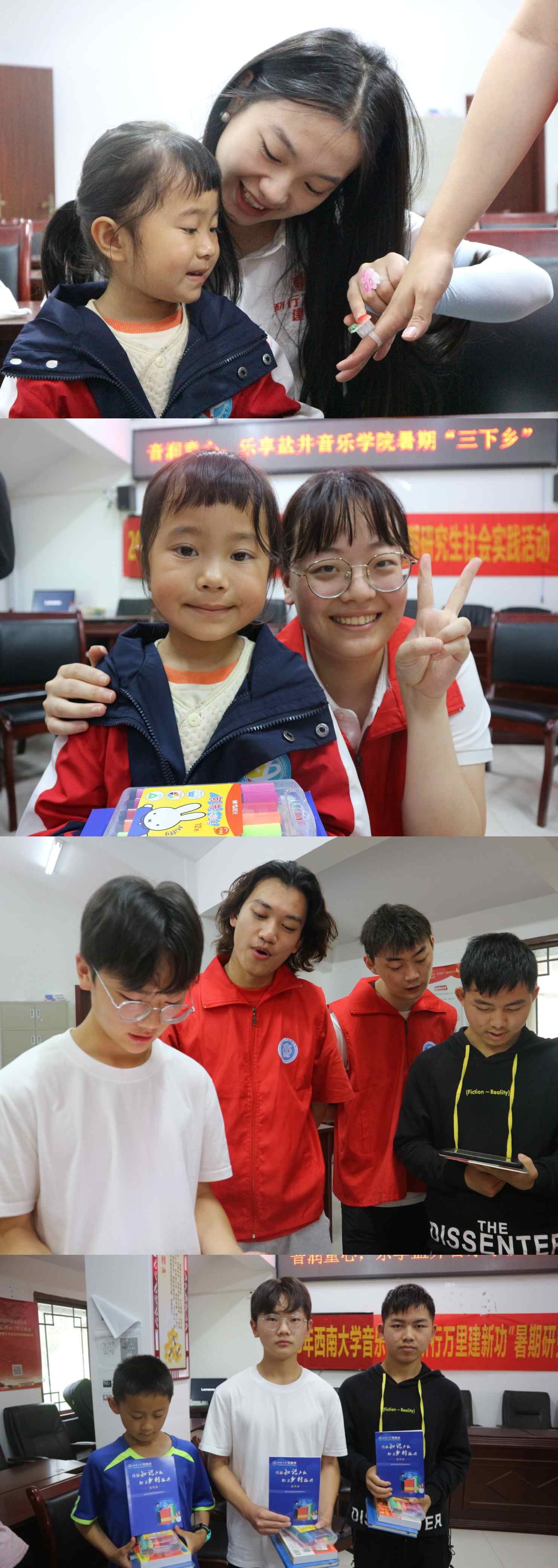4日,实践队前往中益乡盐井村践行美育乡村,用音乐关爱留守儿童,暖心田、润童心,开展温暖有爱的音乐课。由于隔代养育、长期与父母分别等现实情况,留守儿童存在着隐性或者显性的情感缺失,大多表现得内敛、敏感、偏激。实践队队员们带领小朋友们认识、鉴赏手风琴、巴松、古琴等乐器,引导小朋友们通过音乐去记录记忆,表达情感,使得心灵得到疗愈,最后教唱了一曲合唱《送别》,给小朋友们埋下了深深的音乐情感寄托。课堂结束后,实践队为留守儿童们送上文具和读物,希望通过这样一次行动为留守儿童们点亮一盏灯。