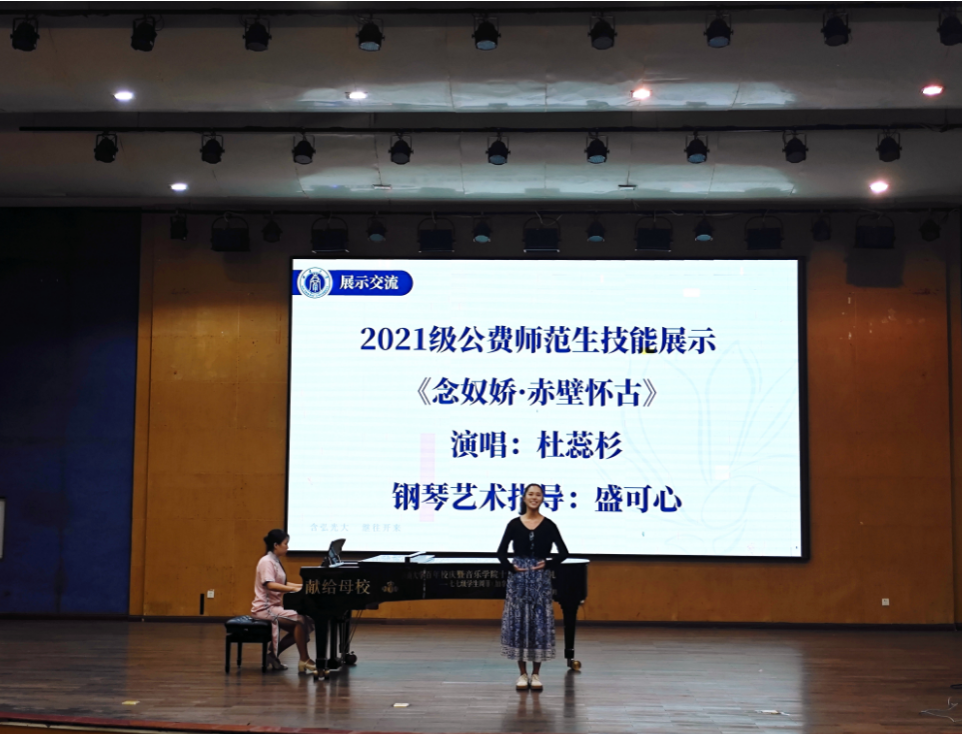 大会第二阶段进行了师范生技能展示和实习经验交流。2021级优秀实习生代表杜蕊杉现场展示了歌曲《念奴娇·赤壁怀古》,用歌声展现出必赢3003no1线路检测中心学子扎实的专业基础与出色的声乐技巧。随后,与会各位老师、2021级实习生代表与2022级公费师范生开展交流答疑活动。