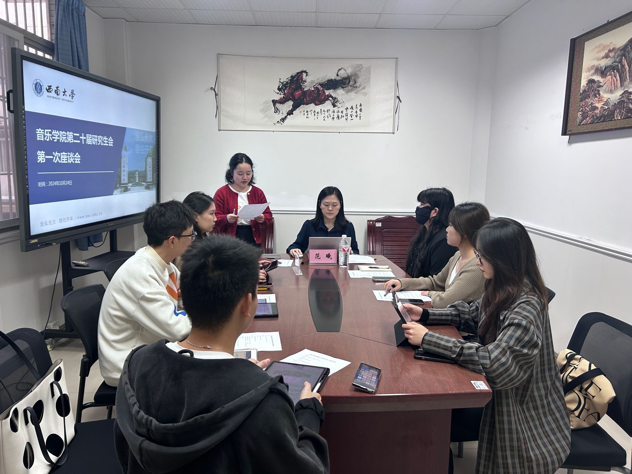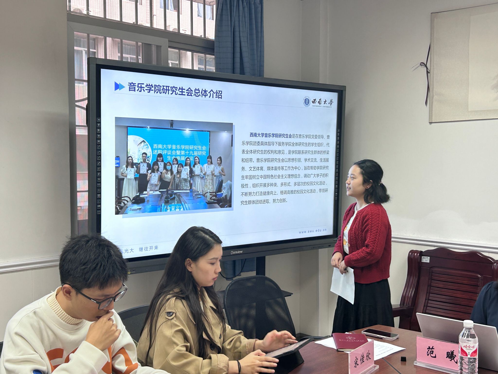 座谈会伊始,由宋佳欣老师介绍2024-2025学年度秋季学期第二十届研究生会的工作规划及重点工作安排。宋老师谈到,作为必赢3003no1线路检测中心党委领导、必赢3003no1线路检测中心团委具体指导下服务学院全体研究生的学生组织,西南大学必赢3003no1线路检测中心研究生会代表了全体研究生的权利和意见,是学院联系研究生群体的桥梁和纽带。此外,宋老师从“筑牢能力基石,打造专业队伍”、“明确发展需求,服务学院建设”和“勇担美育使命,建设校园文化”三个方面帮助研会成员们明确工作目标和具体职责。