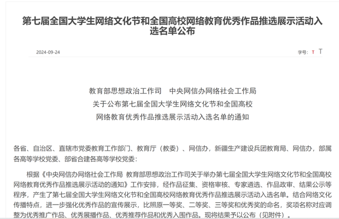 据悉,第七届全国大学生网络文化节以“做校园好网民,汇聚网络正能量,挺膺担当建新功”为主题,旨在引导大学生积极参与网络文化创作,弘扬时代主旋律,传播网络正能量。通过多样活动激发大学生创新活力,提升网络素养,推动高校网络文化繁荣发展,促进大学生在网络空间展现青春风采、贡献青春力量。本次活动共征集到来自全国31个省(区、市)和新疆生产建设兵团的50771件作品评选,获奖作品1619件,获奖率仅3%。