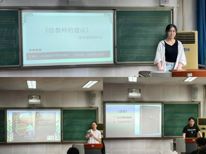 分享环节中,冉雨禾、谢子涵、董雪伟、石林亿、贾林菲、韦远秋、张指荣七位分享者带着精心准备的书籍和满满的感悟依次登场,他们中有人分享文学史上的经典著作,也有人分享音乐专业相关的书籍,每位同学都以生动的语言和丰富的情感发表了自己独到的见解,为大家带来了一场令人印象深刻的分享会。