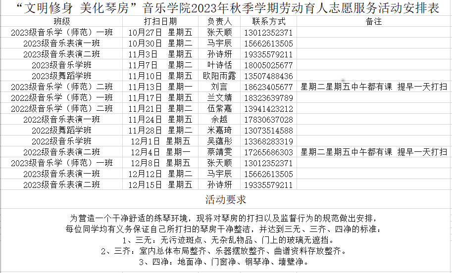 “文明修身 美化琴房”必赢3003no1线路检测中心2023年秋季学期劳动育人志愿服务活动轮班表