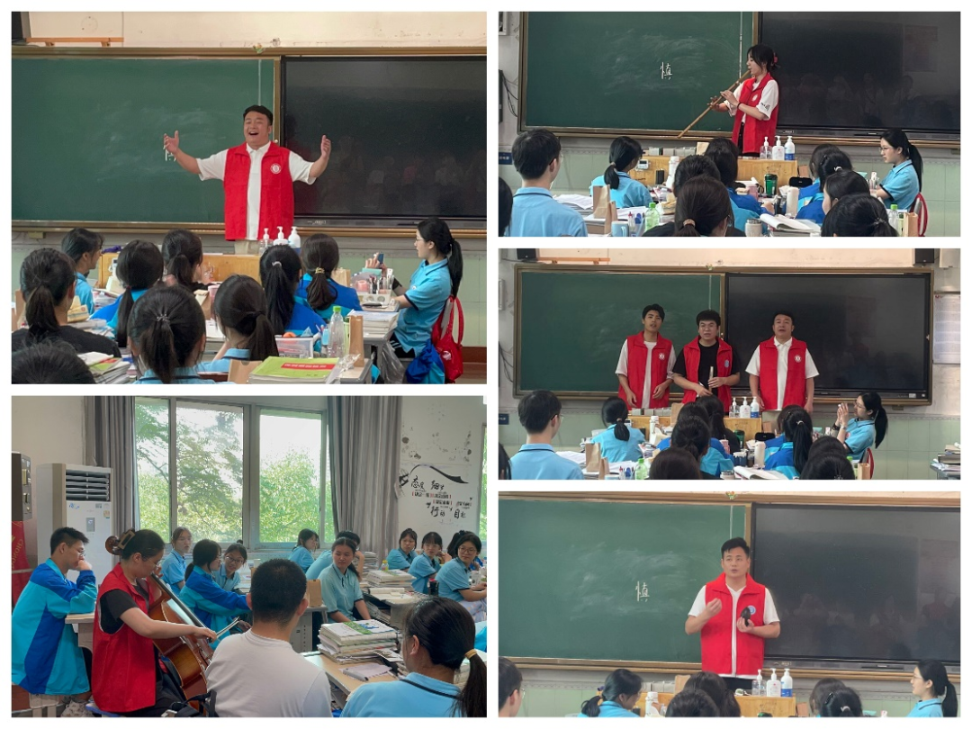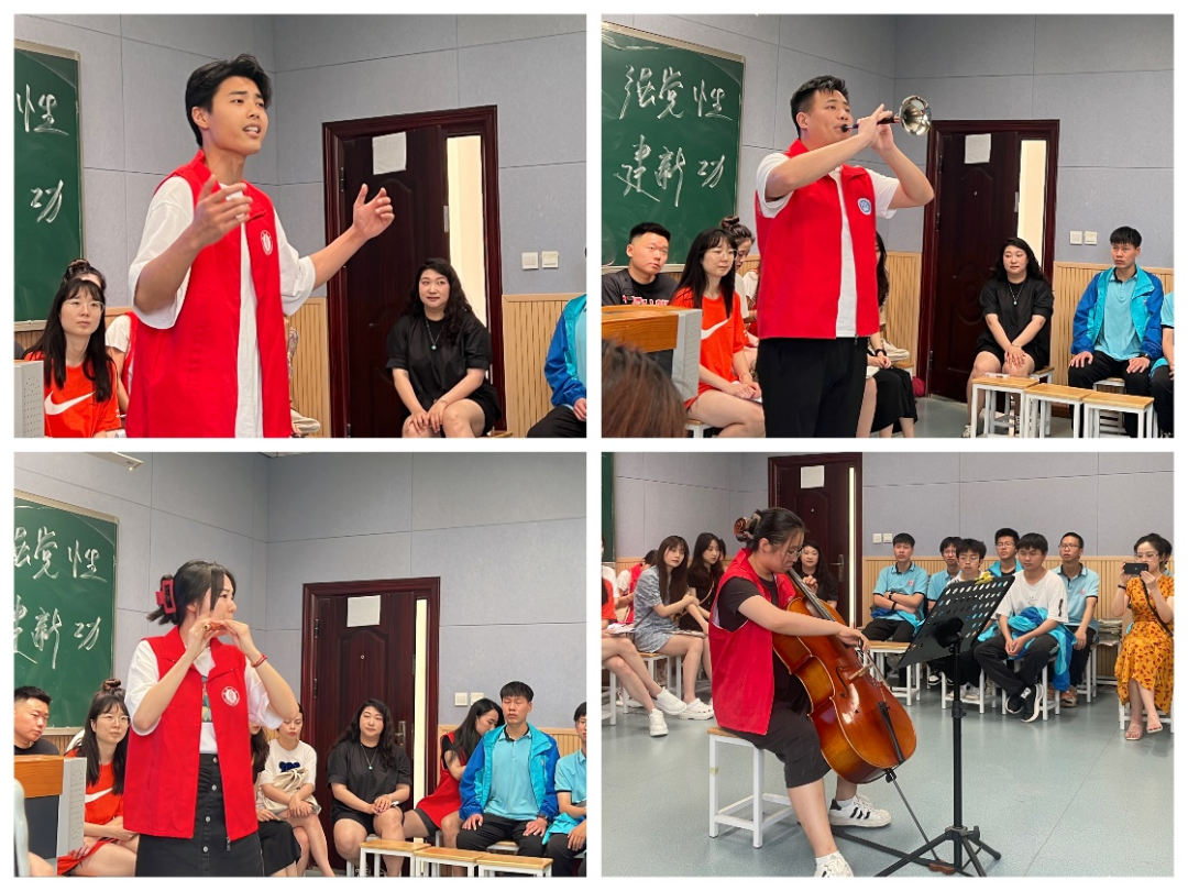 站上讲堂,唱响音乐美育。2020级研究生毕业生党支部全体党员同志站上讲堂,给同学们带去唢呐、竹笛、箫、管、提琴等多种乐器现场演奏,还有云南民歌、河南民歌、藏族民歌、蒙古族民歌等多地地方小调、长调等声乐演唱,更有“中式说唱”——口技表演,引得同学们满堂喝彩。所有表演作品均取自经典红歌和中国优秀传统音乐作品,给同学们带去视听体验的同时,也增强了同学们对于中国传统音乐文化、中西方音乐风格对比的美的体悟,一场关于音乐的美育种子在此刻种下。