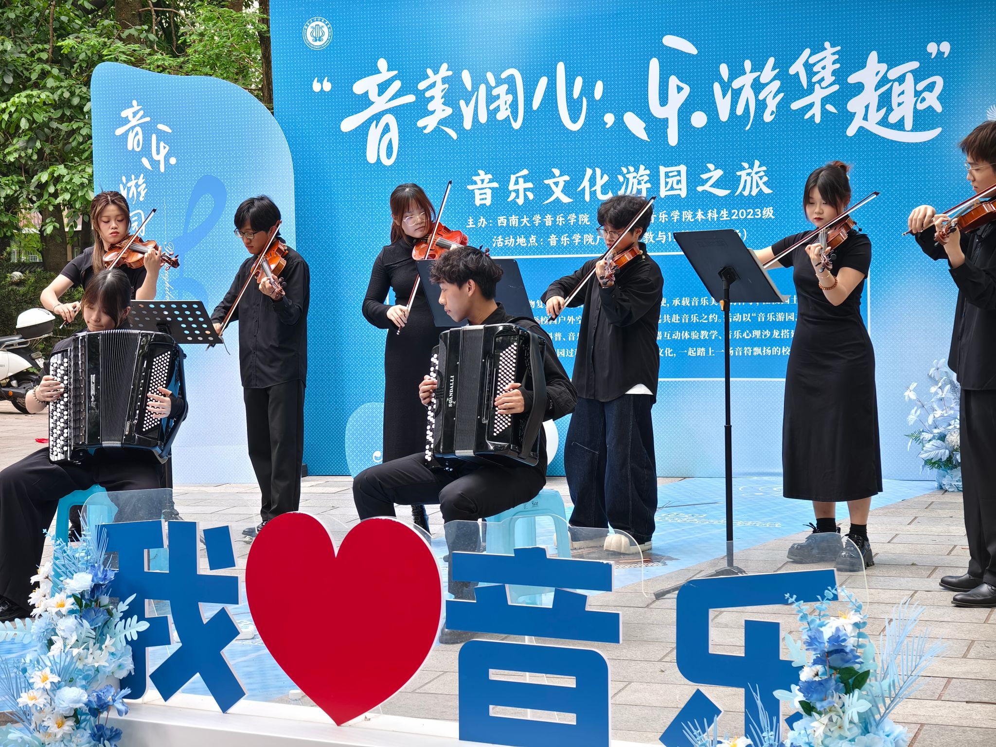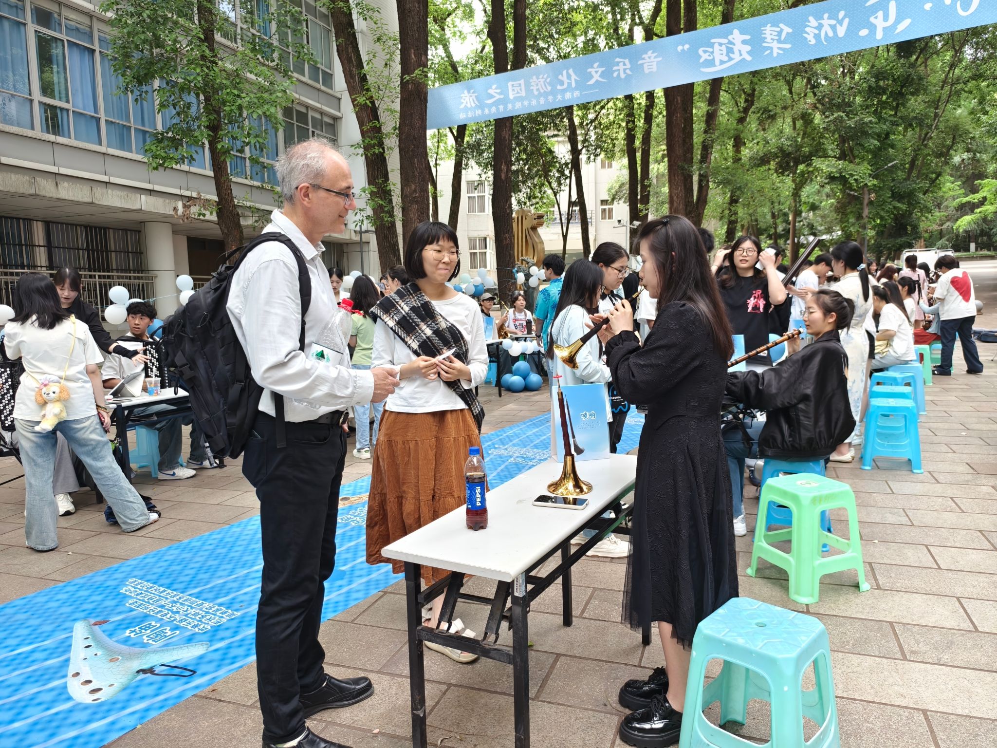 2025年5月9日由必赢3003no1线路检测中心主办,本科生2023级承办的的“音美润心,乐游集趣”音乐文化游园之旅——美育角系列活动成功举办。活动将音乐美育延伸至校园户外空间,与西大学子共赴一场音乐之约。活动通过“音乐+通感体验”的形式,面向全校师生开展中西乐器展示、音乐文化科普、音乐舞蹈视听鉴赏、乐器互动体验教学、音乐心理沙龙等活动,搭建可听、可视、可触的音乐通感户外课堂,带领大家在游园过程中沉浸式体验音乐文化,一起踏上一场音符飘扬的校园美育之旅。